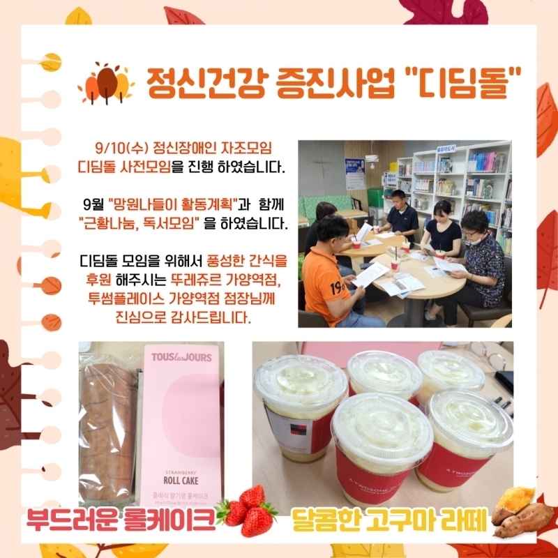 µðµõµ¹ ÀÚÁ¶¸ðÀÓÀº Á¤½ÅÀå¾ÖÀÎ ´ç»çÀÚµéÀÌ ¼­·ÎÀÇ »îÀ» ³ª´©°í ÁöÁöÇÏ¸ç ¼ºÀåÇÏ´Â ¸ðÀÓÀÔ´Ï´Ù. ¾à¹° º¹¿ë°ú ÀÏ»ó°ü¸®¿¡ ´ëÇÑ °æÇèÀ» °øÀ¯Çϰí, ´Ù¾çÇÑ Ã¼Çè°ú ¿©°¡È°µ¿À» ÇÔ²²Çϸç Áö¿ª»çȸ ¼Ó °Ç°­ÇÑ °ü°è¸¦ À̾´Ï´Ù. µðµõµ¹ ¸ðÀÓÀÌ µû¶æÇÏ°Ô À̾îÁú ¼ö ÀÖµµ·Ï ÇÔ²²ÇØÁּż­ °¨»çÇÕ´Ï´Ù.
