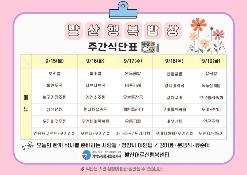 [¹ß»ê¼¾ÅÍ] °¡¾ç5 ¹ß»êÇູ¹ä»ó - 9¿ù ÁÖ°£½Ä´ÜÇ¥ (9/15~19)
