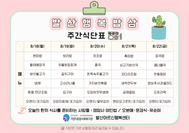 [¹ß»ê¼¾ÅÍ] °¡¾ç5 ¹ß»êÇູ¹ä»ó - 8¿ù ÁÖ°£½Ä´ÜÇ¥ (8/18~22)