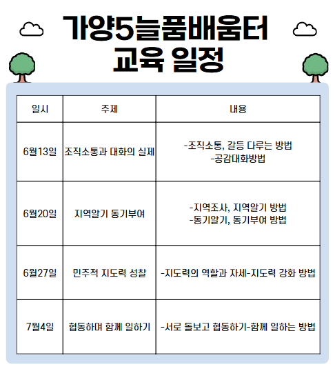 ¿ÃÇØ¿¡´Â °¡¾ç5´Ãǰ¹è¿òÅ͸¦ ¼ö·áÇÑ Áֹεé·Î Áö¿ª Ȱµ¿¿¡ Âü¿©Çϰí ÀÖ´Â ÁֹεéÀÇ ¸®´õ½ÊÀ» °ÈÇÏÇÏ´Â ¸ñÀûÀ¸·Î ±³À° ³»¿ëÀ» ±¸¼ºÇÏ¿´½À´Ï´Ù. ÁֹεéÀº '´ëÈÀÇ ±â¼ú, ¼ÒÅë, ¸¶À» Ȱµ¿, ȸÀÇÇÒ ¶§ ÁöÄÑ¾ß ÇÒ ¿¡Æ¼ÄÏ, µ¿³×¿¡ ´ëÇÑ °ü½ÉÀ» ³ôÀÌ´Â ¹æ¹ý' µî¿¡ ´ëÇÑ ÀǰßÀ» Áּ̰í, Àü¿¡µµ °ÀǸ¦ ÇϽøç ÁÖ¹ÎÀÇ ¸¸Á·µµ°¡ ³ôÀ¸½Å °»ç´Ô°ú ÀÌ¿¡ ´ëÇØ ¼ÒÅëÇÏ¿´½À´Ï´Ù.
