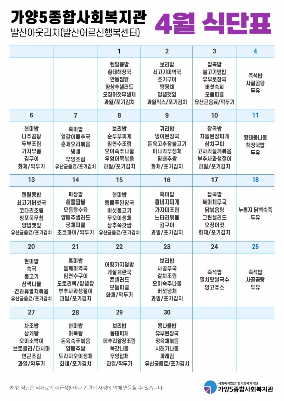 ¹ß»ê¾Æ¿ô¸®Ä¡ 4¿ù ½Ä´ÜÇ¥ÀÔ´Ï´Ù.