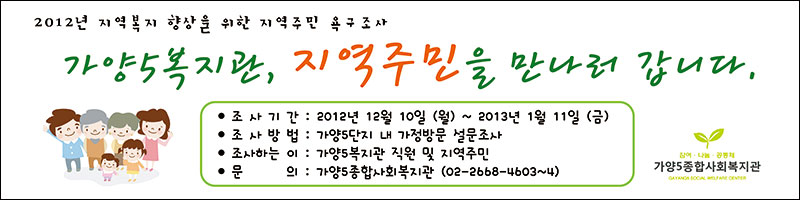 2013³â 1¿ù 11ÀϱîÁö, °¡¾ç5´ÜÁö ³» °¡Á¤À» ¹æ¹®ÇÏ¿© ÁֹΠºÐµéÀ» ¸¸³ª°í Áö¿ªÁ¶»ç¸¦ ½Ç½ÃÇÕ´Ï´Ù.