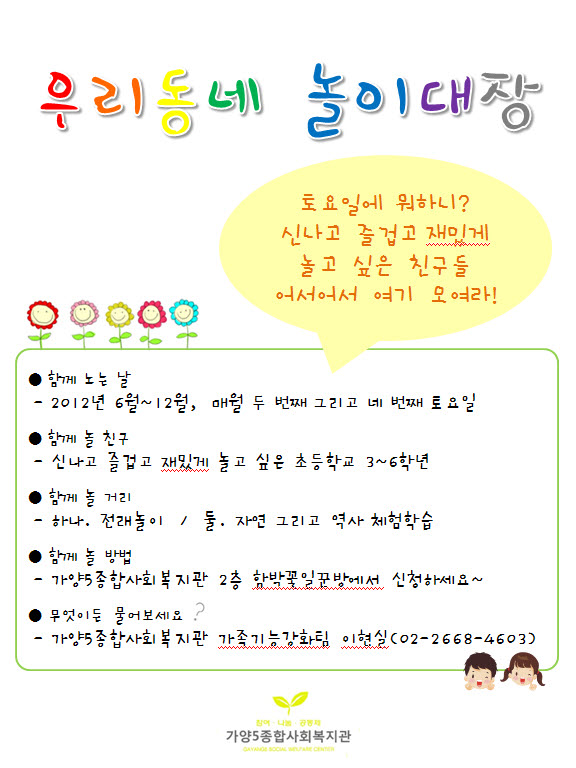 °¡¾ç5Á¾ÇÕ»çȸº¹Áö°ü¿¡¼´Â6¿ùºÎÅÍ 12¿ù±îÁö, ¸Å¿ù µÎ ¹øÂ° ±×¸®°í ³× ¹øÂ° Åä¿äÀÏ¿¡¡®¿ì¸®µ¿³× ³îÀÌ´ëÀ塯À» ÁøÇàÇÕ´Ï´Ù.