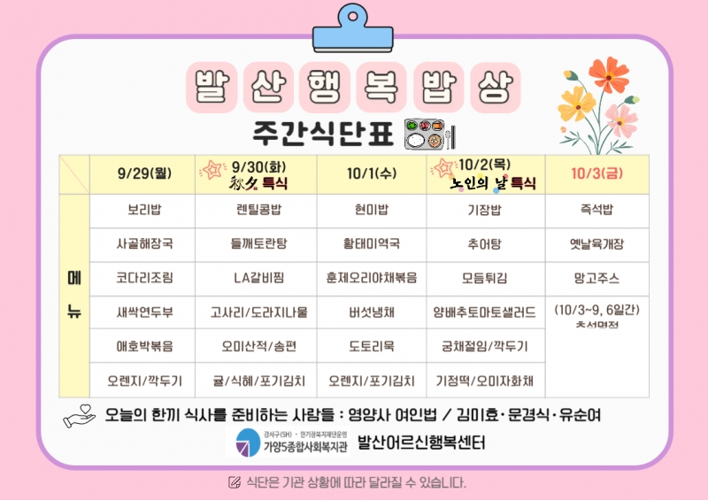 9¿ù ¸¶Áö¸· ÁÖ¿Í 10¿ù ù° ÁÖ, ¹ß»êÇູ¹ä»ó ÁÖ°£½Ä´ÜÇ¥¸¦ °øÀ¯ÇÕ´Ï´Ù.