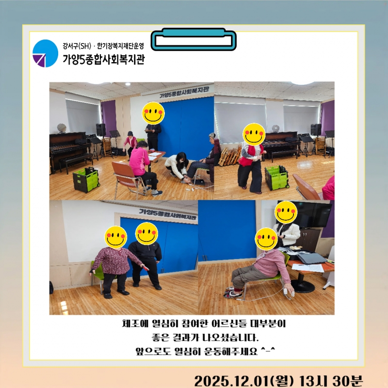 üÁ¶ ÇÁ·Î±×·¥ Á¾·á ÈÄ, ¿ì¸® ¾î¸£½ÅµéÀÇ º¯È¸¦ È®ÀÎÇϱâ À§ÇØ ´ë»çÁõÈıº »çÈİ˻縦 ½Ç½ÃÇÏ¿´°í, ü¼ººÐ °Ë»ç¿Í ü·Â °ËÁøÀ» ÅëÇØ ±àÁ¤ÀûÀÎ È¿°ú¸¦ È®ÀÎÇÒ ¼ö ÀÖ¾ú½À´Ï´Ù.