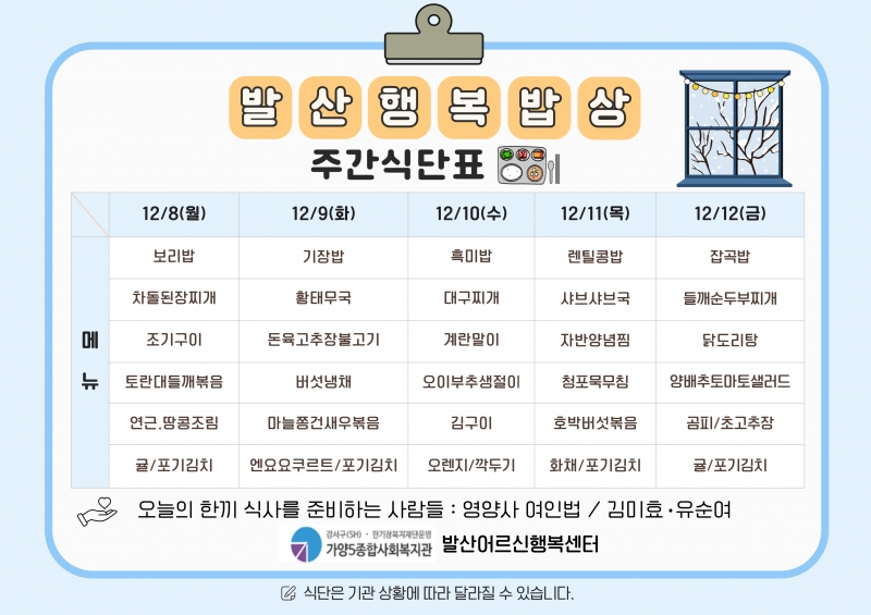 [¹ß»ê¼¾ÅÍ] °¡¾ç5 ¹ß»êÇູ¹ä»ó - 12¿ù ÁÖ°£½Ä´ÜÇ¥ (12/8~12)