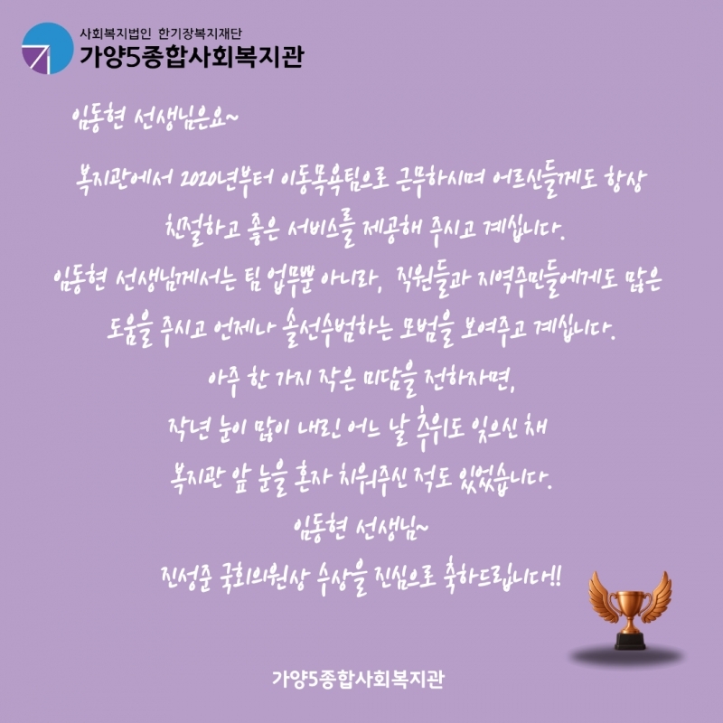 ÃÑȸ°¡ ÁøÇàµÇ´Â µ¿¾È, ¿ì¸® º¹Áö°ü À̵¿¸ñ¿å»ç¾÷ÆÀ ÀÓµ¿Çö ¼±»ý´Ô²²¼­ Áø¼ºÁØ ±¹È¸ÀÇ¿ø»óÀ» ¼ö»óÇϽô ±â»Û ¼Ò½ÄÀÌ ÀÖ¾ú½À´Ï´Ù.