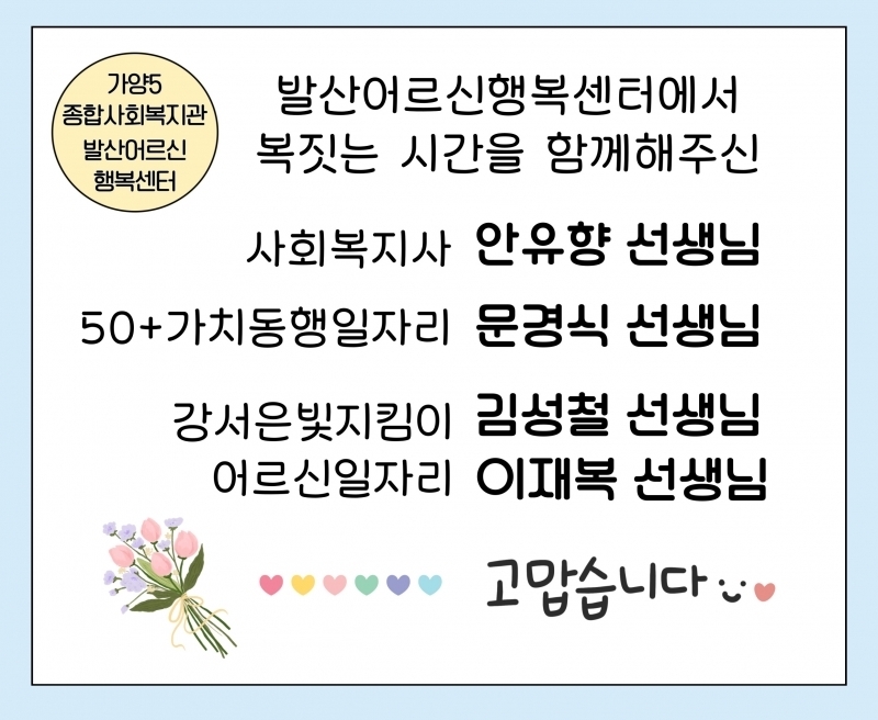 10¿ù ¸»ºÎÅÍ ¿À´Ã±îÁö, ¿ì¸® °¡¾ç5Á¾ÇÕ»çȸº¹Áö°ü ¹ß»ê¾î¸£½ÅÇູ¼¾Å͸¦ µçµçÇÏ°Ô ÁöÄÑÁ̴ּø ³× ºÐÀÇ ¼±»ý´ÔÀÌ °¢ÀÚÀÇ °ÉÀ½À» À̾°Ô µÇ¾ú½À´Ï´Ù.