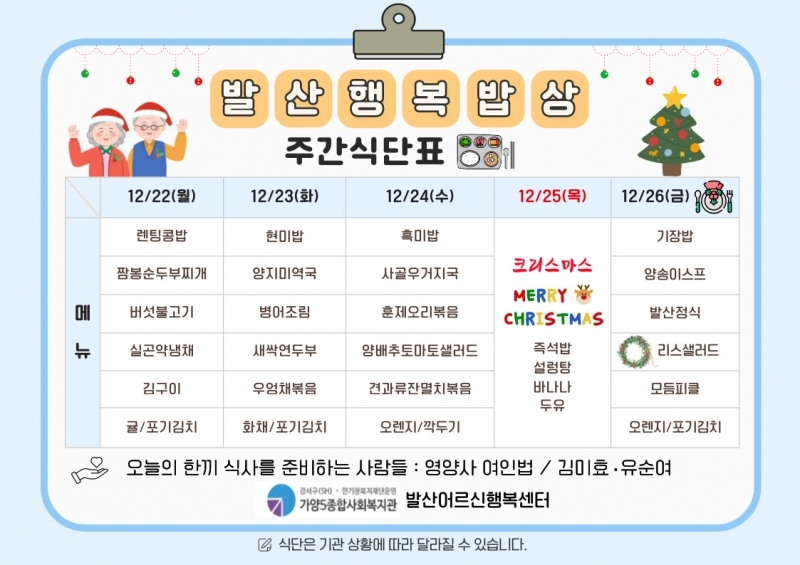 À̹ø ÁÖ´Â Á÷Á¢ ÁغñÇÏ´Â ½Ä»ç¿Í Å©¸®½º¸¶½º ´ëü½ÄÀ» ÇÔ²² ³ª´©¸ç ÇÑ ÇØ¸¦ Á¤¸®ÇÏ´Â ¸¶Áö¸· ¹ä»óÀÌ À̾îÁý´Ï´Ù. 26ÀÏÀº Åð»ç¸¦ ¾ÕµÐ Á¶¸®»ç ¼±»ý´ÔÀÇ ¼Õ¸ÀÀÌ ´ã±ä ¸¶Áö¸· Á÷Á¢ ½Ä»ç°¡ Á¦°øµÉ ¿¹Á¤ÀÔ´Ï´Ù.