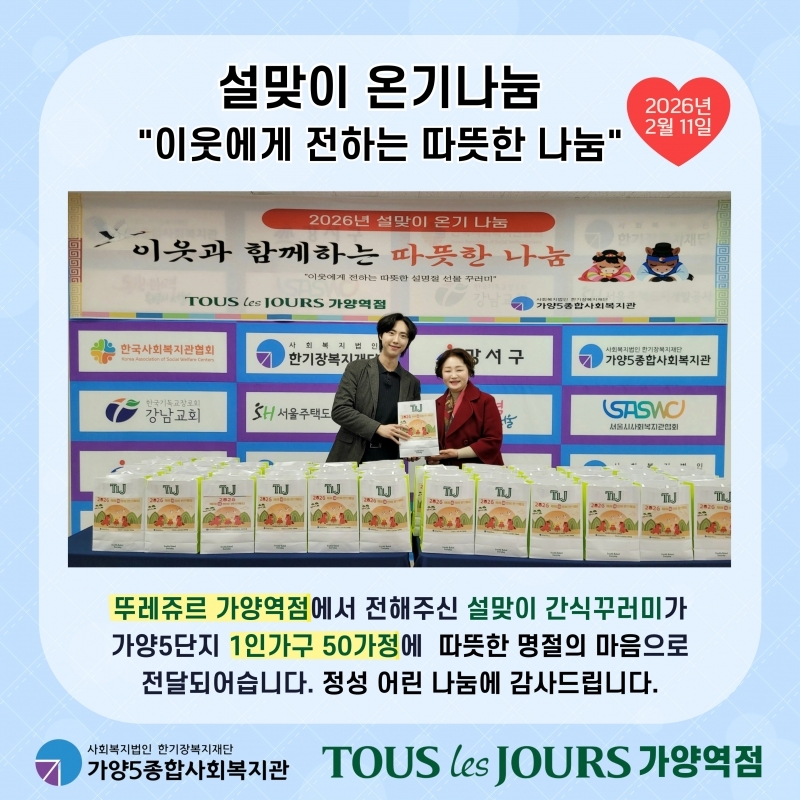 2026³â 2¿ù 11ÀÏ ¿ÀÈÄ 4½Ã, °¡¾ç5Á¾ÇÕ»çȸº¹Áö°ü¿¡¼´Â ¶Ñ·¹Á긣 °¡¾ç¿ªÁ¡ÀÇ ÈÄ¿øÀ¸·Î 2026³â ¼³¸ÂÀÌ ¿Â±â³ª´® Çà»ç Àü´Þ½ÄÀ» ÁøÇàÇÏ¿´½À´Ï´Ù. À̹ø Çà»ç´Â Áö¿ª ³» 1Àΰ¡±¸ ¾î¸£½ÅµéÀÌ µû¶æÇÑ ¸íÀýÀ» º¸³»½Ç ¼ö ÀÖµµ·Ï ¸¶·ÃµÇ¾úÀ¸¸ç, ¶Ñ·¹Á긣 °¡¾ç¿ª Á¡ÀÇ ÈÄ¿øÀ¸·Î ÆÏ»§ 50°³, »ï°èÁ× 50°³, µÎÀ¯ 50°³, ¸À¹ã 50°³ Á¤¼º °¡µæÇÑ °£½Ä²Ù·¯¹Ì°¡ ÁغñµÇ¾ú½À´Ï´Ù.