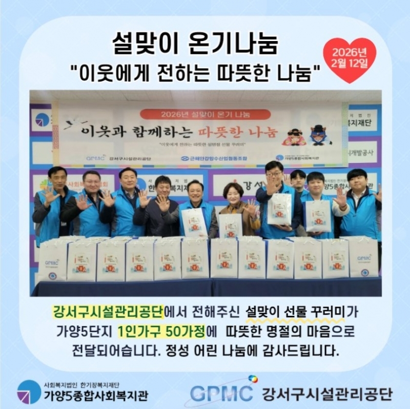 2026³â 2¿ù 12ÀÏ ¿ÀÈÄ 2½Ã, °¡¾ç5Á¾ÇÕ»çȸº¹Áö°ü¿¡¼´Â °¼±¸½Ã¼³°ü¸®°ø´ÜÀÇ ÈÄ¿øÀ¸·Î 2026³â ¼³¸ÂÀÌ ¿Â±â³ª´® Çà»ç Àü´Þ½ÄÀ» ÁøÇàÇÏ¿´½À´Ï´Ù. À̹ø Çà»ç´Â Áö¿ª ³» 1Àΰ¡±¸ ¾î¸£½ÅµéÀÌ µû¶æÇÑ ¸íÀýÀ» º¸³»½Ç ¼ö ÀÖµµ·Ï ¸¶·ÃµÇ¾úÀ¸¸ç, ¶±±¹¶±(3kg) 50°³, ¼³··ÅÁ 110°³, ¶ó¸é2Á¾ °¢110°³, ±¸¿î±è(3°³ÀÔ) 50°³ Á¤¼º °¡µæÇÑ ¼±¹° ²Ù·¯¹Ì°¡ ÁغñµÇ¾ú½À´Ï´Ù.